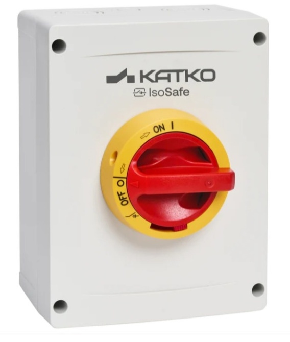 Katko IsoSafe KEM 363 YR M3 to 3‑biegunowy wyłącznik izolacyjny 63 A (IP66) w poliwęglanowej obudowie. Odporny na wilgoć, pył i UV, z możliwością blokady uchwytu na kłódkę — idealny do instalacji przemysłowych i technicznych wymagających bezpiecznego odłączania zasilania.