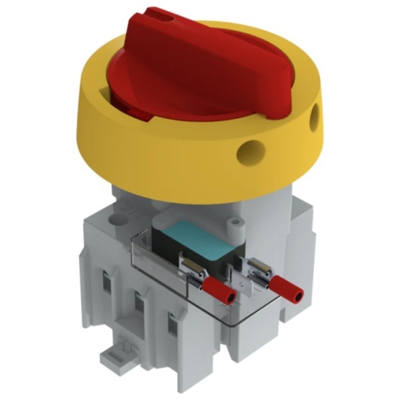Zestaw wykonany jest w standardowej kolorystyce żółto-czerwonej, stosowanej dla wyłączników głównych i bezpieczeństwa, co zwiększa widoczność elementu sterującego oraz spełnia wymagania stosowane w aplikacjach przemysłowych.